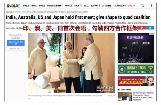 为深化安全合作,协调地区基础设施融资方案,美国、日本、印度和澳大利亚2017年11月已重启了四方会谈。
