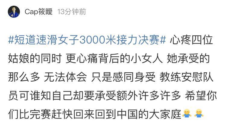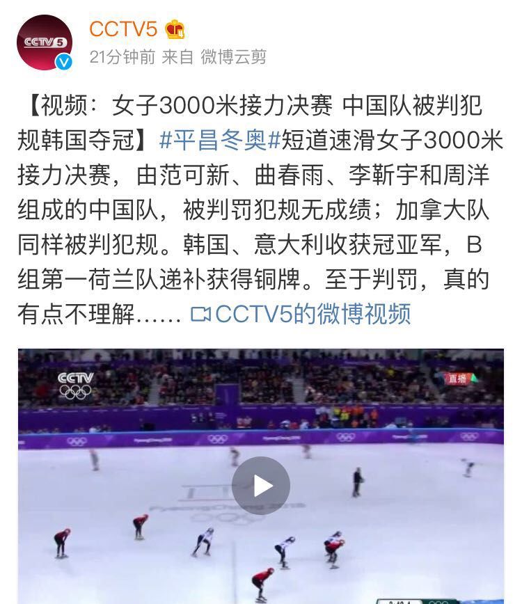 来自微博@CCTV5消息,在刚刚结束的平昌冬奥会短道速滑女子3000米接力决赛,由范可新、曲春雨、李靳宇和周洋组成的中国队,被判罚犯规无成绩;加拿大队同样被判犯规。韩国、意大利收获冠亚军,B组第一荷兰队递补获得铜牌。至于判罚,真的有点不理解……
