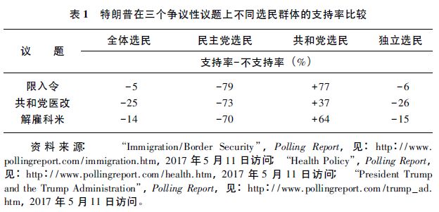 即便在新政府上台以来涌现出的极具争议性的议题上,特朗普也保持了总体较低但相对极化的民意窘况。如表1所示,以“限入令”、共和党主导的《美国医保法案》以及5月9日解雇联邦调查局时任局长詹姆斯·科米(James Comey)等三个争议性事件中的民意支持率进行比较,特朗普显然在全体选民、独立选民群体中都得到了总体负面评价,其在民主党群体中的负面评价更大,共和党阵营在这些争议性议题上却给予特朗普颇为坚实的支持。