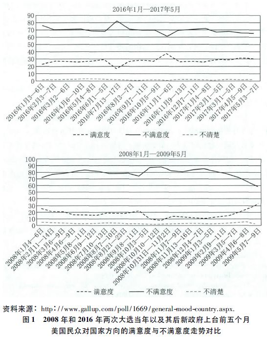 在对联邦政府信任感缺失的同时,美国民众对国家方向也持续不满。如图1所示,选举之后特别是特朗普政府上台以来,民意虽然有所好转,但幅度仍旧微弱。这就意味着,特朗普新政府并未给普通民众对国家前景的期待注入“正能量”。又如图1所示,2009年即奥巴马上台后民众的满意度与不满意度同步呈现出较为明显的积极变化,说明其时的奥巴马新政府为普通民众创造了新的期待。两次政府换届前后民众态度的不同变化,足以说明2016年选举不但没有实现2008年大选的民怨释放效果,反而酿成了民怨情绪的进一步积累。
