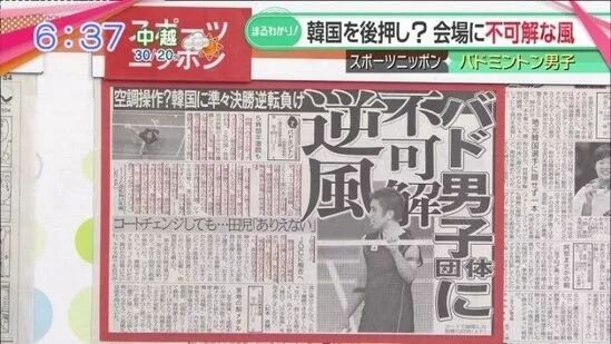 比赛场内,他们遭到了奇怪的妖风——羽毛球男团韩国VS日本的比赛中,日本选手田儿贤一在领先一局后,发现无论自己在场地的哪一端,空调的风总是突然加大风力,而且自己永远在打逆风球。