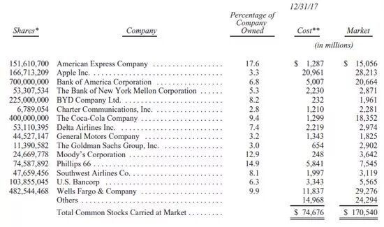 公开信中列出了15个到2017年底所持最大市值的普通股投资。苹果公司以282亿美元跃居第二,目前伯克希尔的持股比例从2016年的1.1%大幅增加值3.3%。