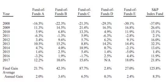 结果发现,这五只成立于2008年的FoF仅在成立当年跑赢了标普500指数,在接下来的9年内,这些基金的成绩有所下滑,表现都不如标普500指数亮眼,这一赌约在2017年正式结束。