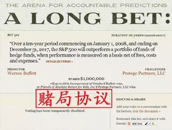 金融危机期间,巴菲特与资产管理公司Protégé Partners的一名创始人设下赌注 100 万美元的赌局,即10年后标普500的ETF表现,将比Protégé Partners挑选的5只FoF更好,这些FoF覆盖了业内超过200只主动管理型的对冲基金,巴菲特押注10 年后标普 500 指数的表现将超过诸多对冲基金。