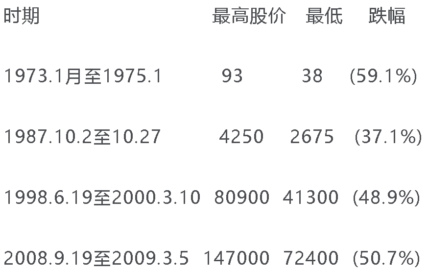 伯克希尔公司本身就极好地说明了短期的价格随机波动,可能掩盖长期的价值增长。在过去的53年当中,伯克希尔通过将盈利进行再投资并让其产生复利的方式创造了奇迹。年复一年,我们砥砺前行。但是,伯克希尔股票仍然经历了4次重挫,以下就是惨案的细节: