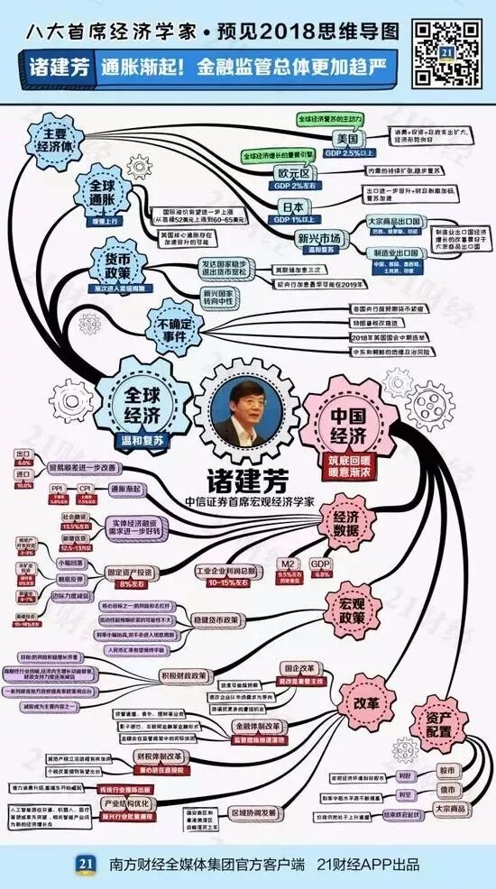 展望2018,中信证券首席宏观经济学家诸建芳认为,全球经济将温和复苏,通胀压力逐步显现,更多的央行货币政策趋于收紧。中国经济筑底回暖,2018年流动性环境整体与2017年相当,消费增速回升,通胀渐起,投资回暖,实体经济融资需求进一步好转。十九大后,改革将乘势而上,金融监管总体看会在现有基础上更加趋严。