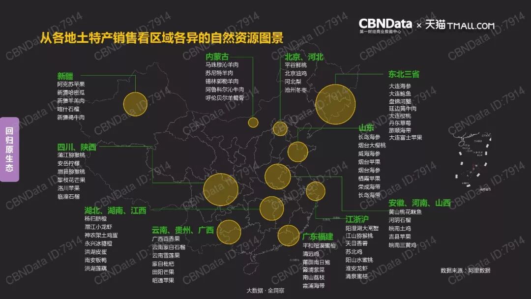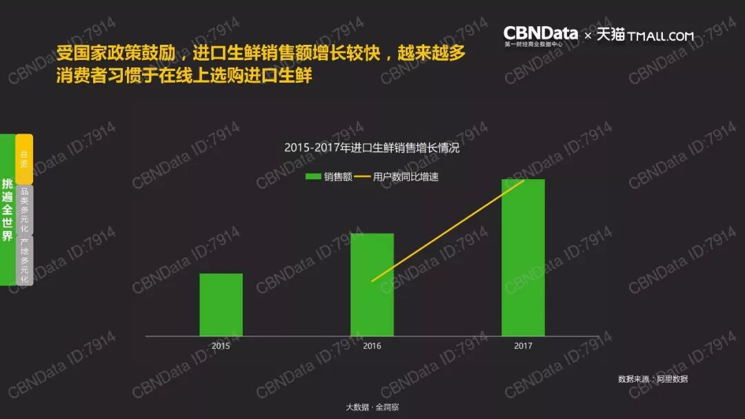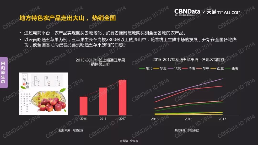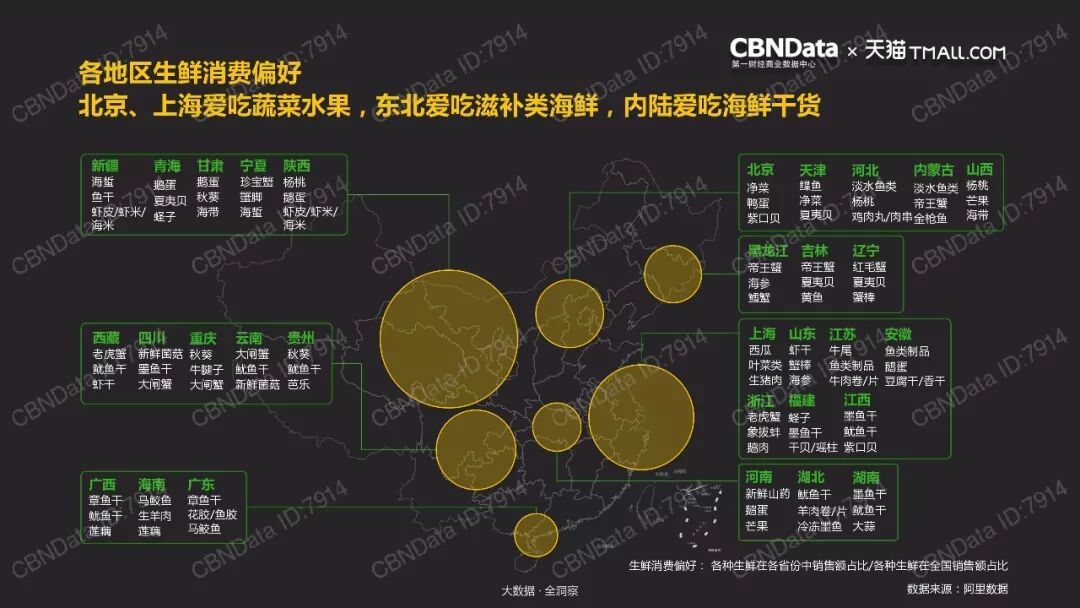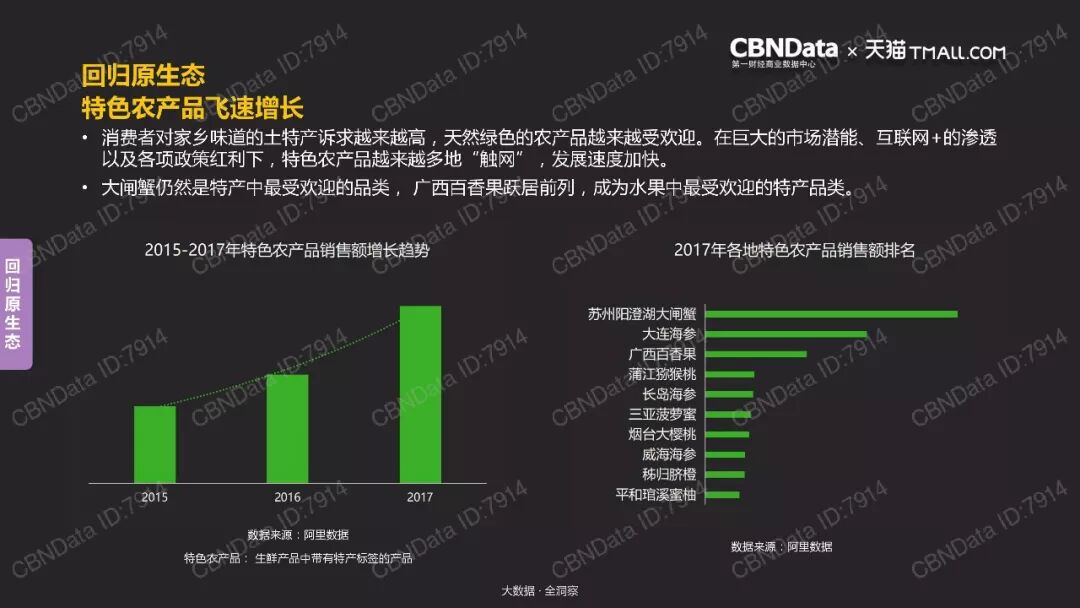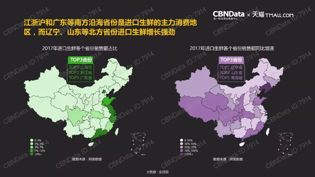 近日,第一财经商业数据中心(CBNData)联合天猫发布了《2018中国餐桌消费潮流趋势报告》(以下简称为CBNData《报告》,基于阿里数据,全方位洞悉国民最新餐桌消费趋势。CBNData《报告》显示,进口生鲜销售额增长较快,越来越多消费者尝试在线上选购进口生鲜,由一二线城市向下线城市渗透,其中江浙沪和广东等沿海省份是进口生鲜的主力消费地区,而辽宁、山东等北方省份进口生鲜增长强劲。与此同时,在巨大的市场潜能、互联网+的渗透以及各项政策红利下,特色农产品越来越多地“触网”,发展速度加快,2017年增速达60%以上。