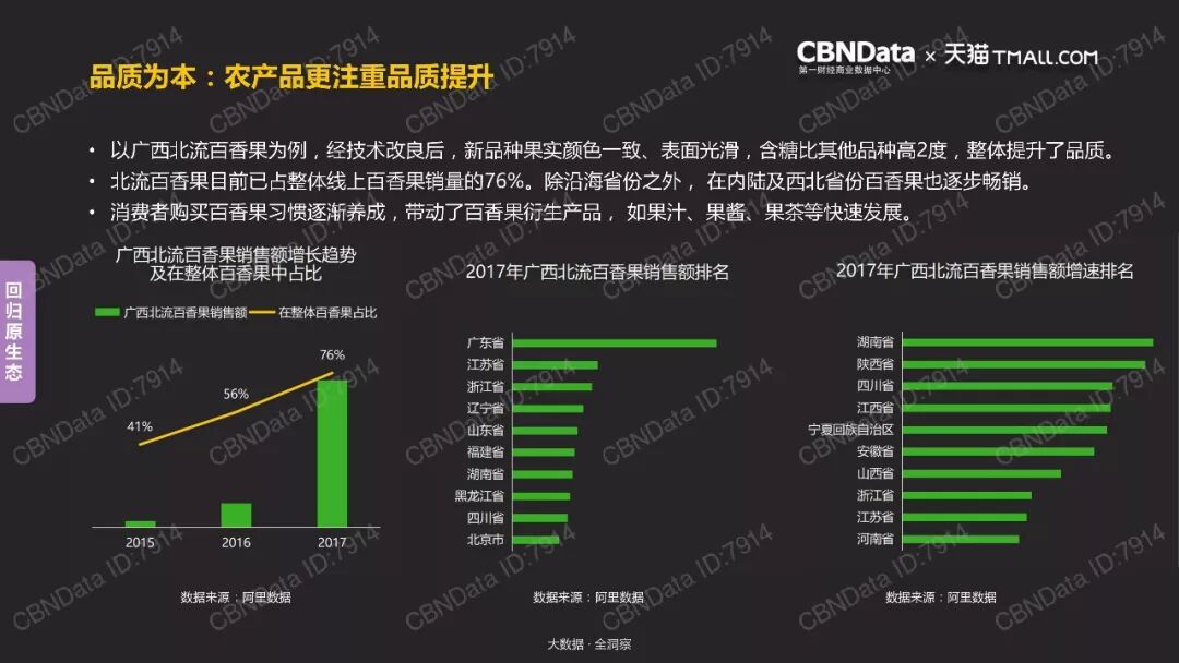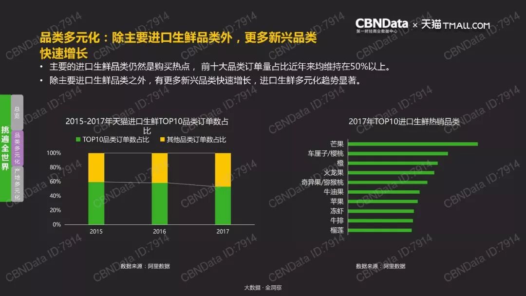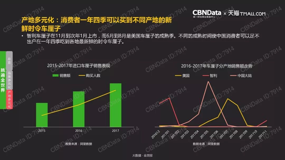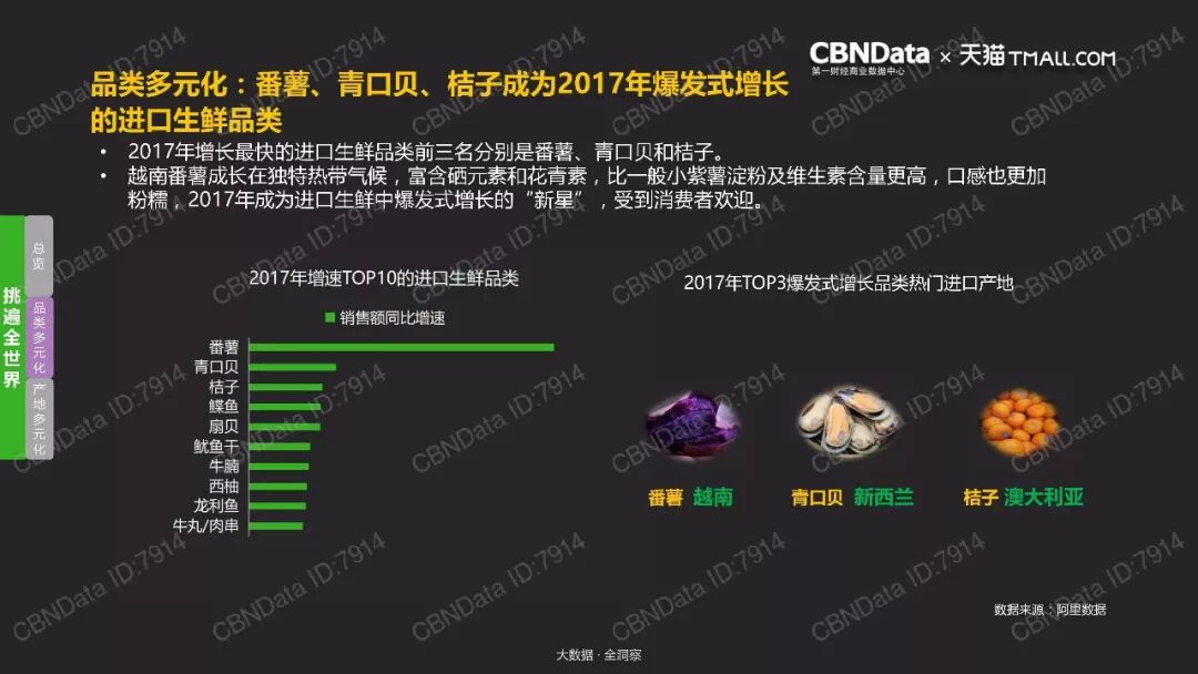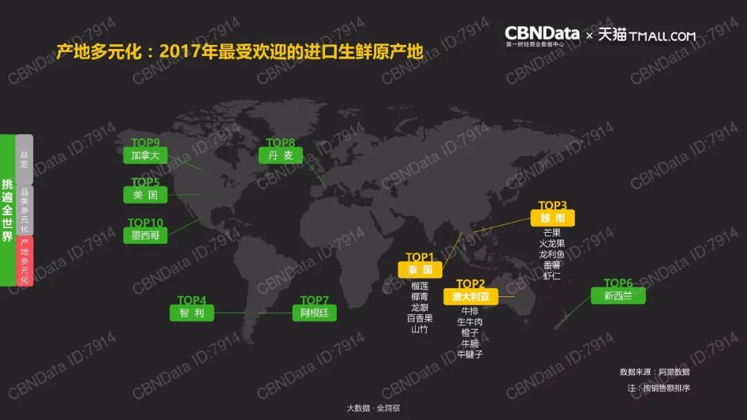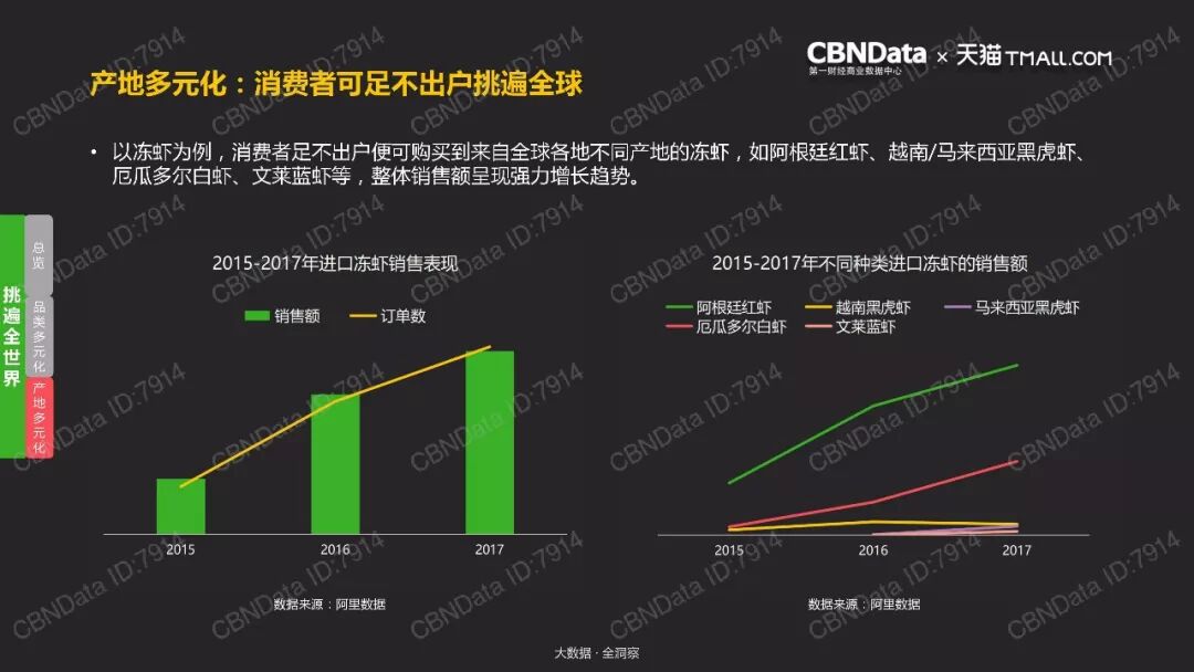 近日,第一财经商业数据中心(CBNData)联合天猫发布了《2018中国餐桌消费潮流趋势报告》(以下简称为CBNData《报告》,基于阿里数据,全方位洞悉国民最新餐桌消费趋势。CBNData《报告》显示,进口生鲜销售额增长较快,越来越多消费者尝试在线上选购进口生鲜,由一二线城市向下线城市渗透,其中江浙沪和广东等沿海省份是进口生鲜的主力消费地区,而辽宁、山东等北方省份进口生鲜增长强劲。与此同时,在巨大的市场潜能、互联网+的渗透以及各项政策红利下,特色农产品越来越多地“触网”,发展速度加快,2017年增速达60%以上。