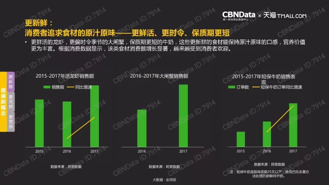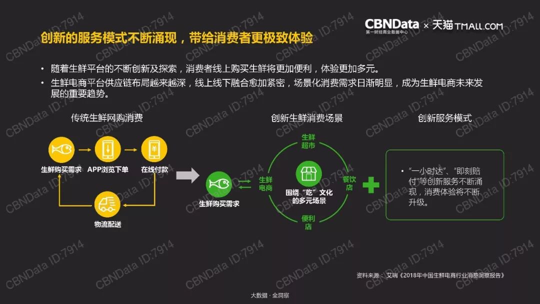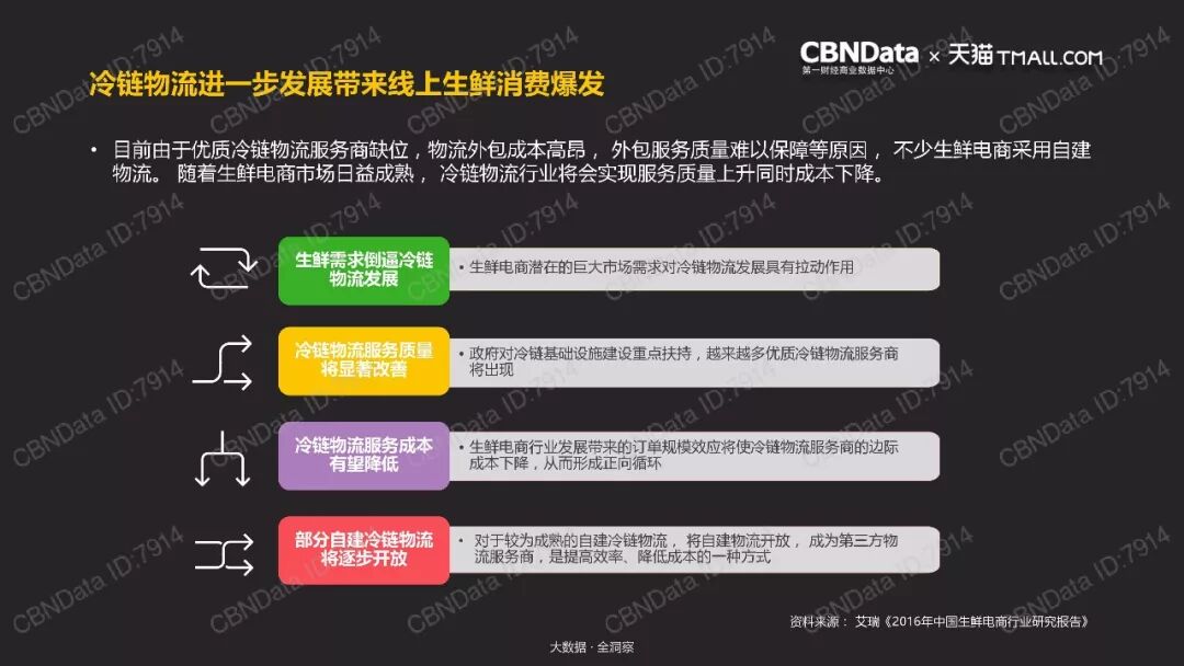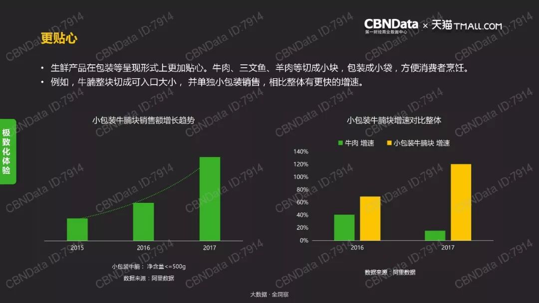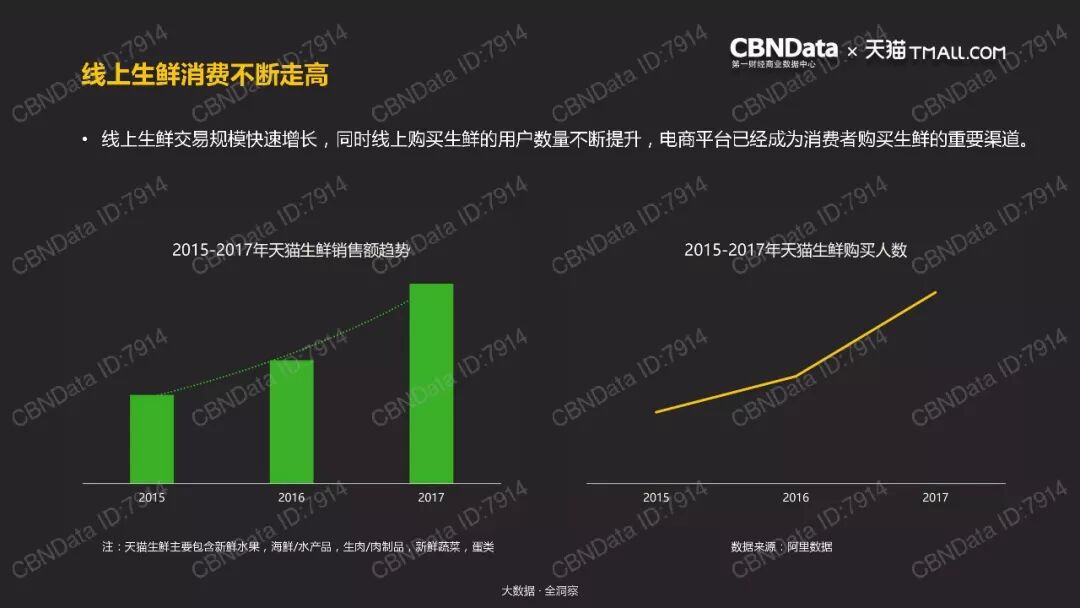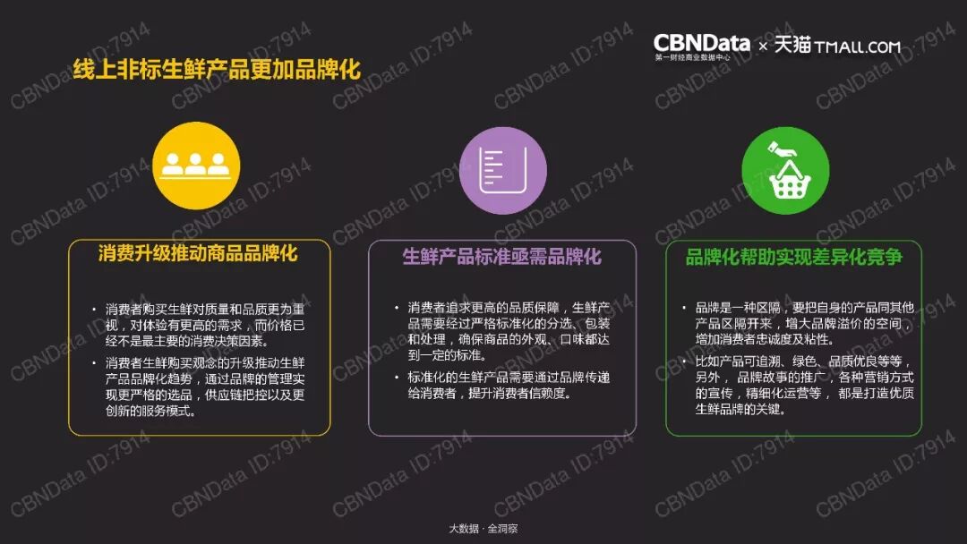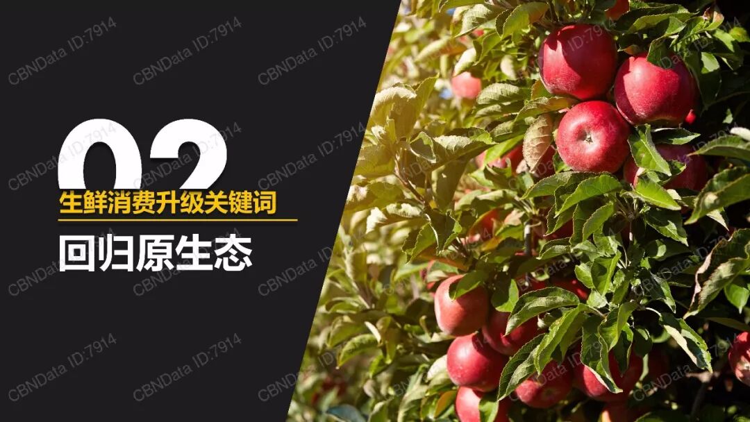 同时,CBNData《报告》揭示了五大生鲜消费升级关键词:健康新概念、挑遍全世界、回归原生态、为品牌买单和极致化体验。此外,CBNData《报告》还指出了未来餐桌消费趋势的四大展望:冷链物流进一步发展带来线上生鲜爆发;线上非标生鲜产品进一步实现品牌化;场景化营销更为普遍,营销趋向内容化;创新的消费体验将持续涌现。