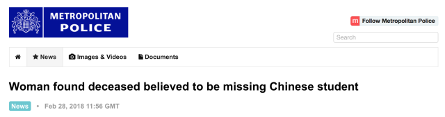 伦敦警方官网刚刚发布消息,正在调查中国公民闫思宏失踪一案的警方找到了一名女性尸体。