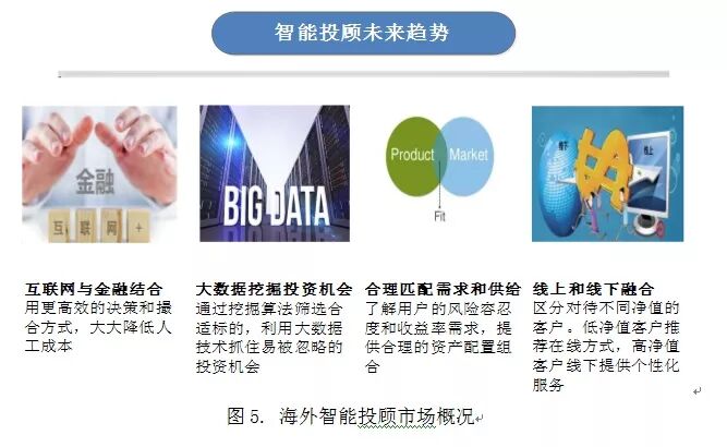 我们认为,智能投顾产业方兴未艾,未来有着众多的可能性,结合当下的社会热点以及行业发展方向,我们认为该领域未来主要的方向应该是进一步结合大数据以及互联网技术,整合线上线下资源,以技术和数据为依托,为用户提供一整套资产配置、风险管理方案,为用户提供真正的智能化投资服务。