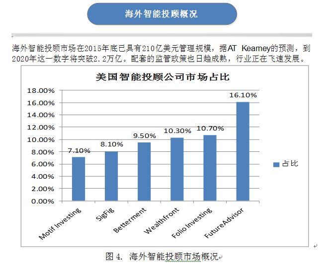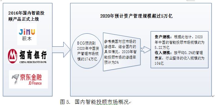 参照AT.Kearney公司对2020年国美智能投顾市场渗透率达到5.6%的预测值,综合考虑到我国目前资本市场产品结构比较单一、监管政策以及投资者尚不太成熟等因素,2020年国内市场渗透率以3%计,参照《2015年中国资产管理市场报告》给出的174万亿元的资产管理规模预测值,中国智能投顾市场在2020年粗略估计的管理规模约为5万亿左右,进一步如果智能投顾的管理费以平均水平0.2%计算,则这个行业的年收入规模约为100亿元左右。也就是说,未来智能投顾市场孕育着一个巨大的财富机会。