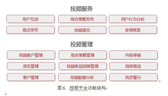 投顾平台的功能结构大体上可以分为两大类,即投顾服务和投顾管理。投顾服务类功能的使用者是投顾,投顾可以在后台使用权限许可范围内的所有功能。投顾管理主要是平台管理员使用,管理对象是平台上的所有投顾。