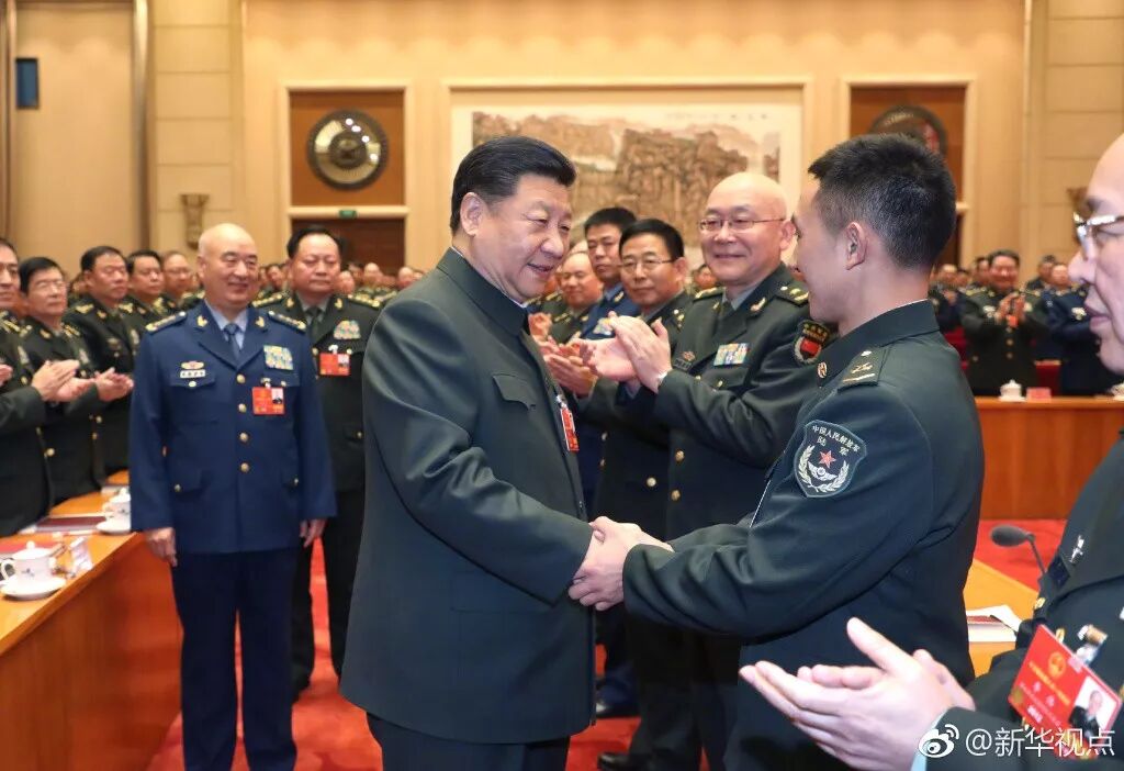 当习近平走进会场时,全场响起热烈掌声。习近平同大家亲切握手,表示来到解放军和武警部队代表团,同各位代表共商国是,感到很高兴。