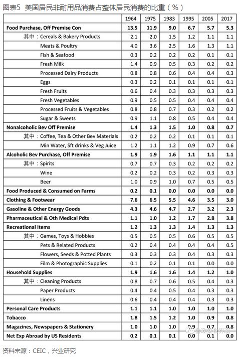 从总量看,美国居民在非耐用品方面的消费占比长期下降,从1964年的37.1%下降至1992年的25.0%,年均下降0.4个百分点,此后逐渐趋于稳定,到2017年占比仍有21.1%,年均仅下降不到0.2个百分点。
