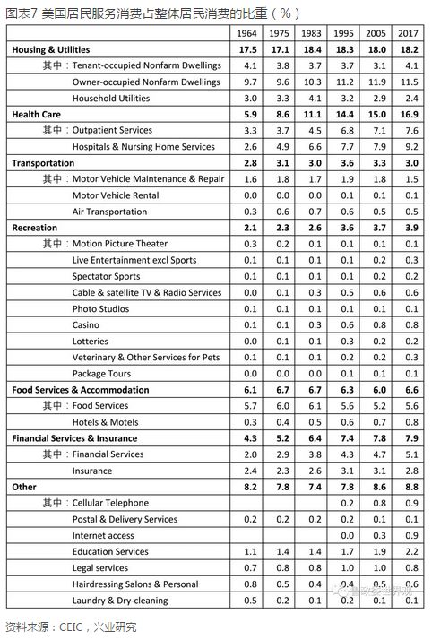 美国居民服务消费占比在过去半个多世纪持续提升,从1964年的48.4%到1983年的57.4%,再到2017年的67.9%。美国服务消费在结构上有以下特征。