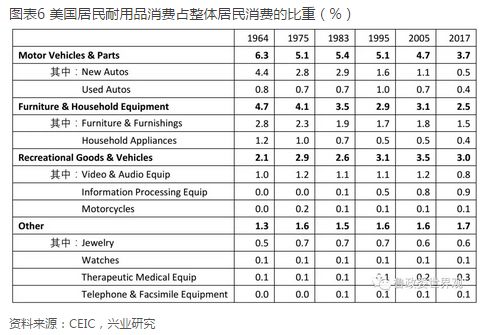 下表列出了美国居民耐用品消费结构的历史演变,我们发现以下三个特征。