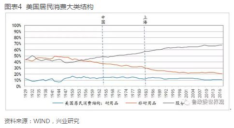 类似地,我们发现2016年上海的非耐用品消费占比30.1%,非常接近美国1983年时的水平29.7%,同时上海2013年至2016年的非耐用品消费占比走势与美国1980年至1983年时的走势基本一致。由此,我们从1983年后美国消费升级的历史或许可以看到2016年后上海等中国发达地区消费升级的前景。