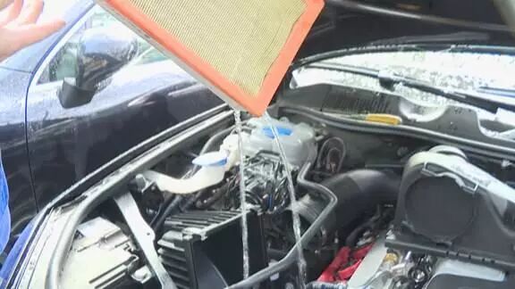 金先生用水枪模拟车辆淋雨的状态。10分钟后打开汽车引擎盖,金先生发现进气道末端原本干燥的空滤已经被水浸湿了三分之一。