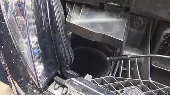 黄女士回忆,出事前一天她的车只是在外面淋了一夜雨,难道和这有关系吗?为了找到原因,黄女士决定做一个试验,她把水从车前部浇下去,让她没有想到的是,水沿着引擎盖和右前大灯的缝隙流进了发动机的进气口。
