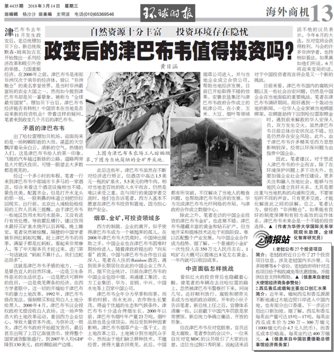 作者:黄日涵,华侨大学国际关系学院院长助理、全球化智库研究员;本文来源:环球时报津巴布韦去年11月发生政变后,老总统穆加贝下台,新总统埃