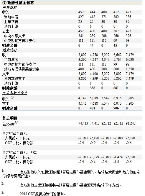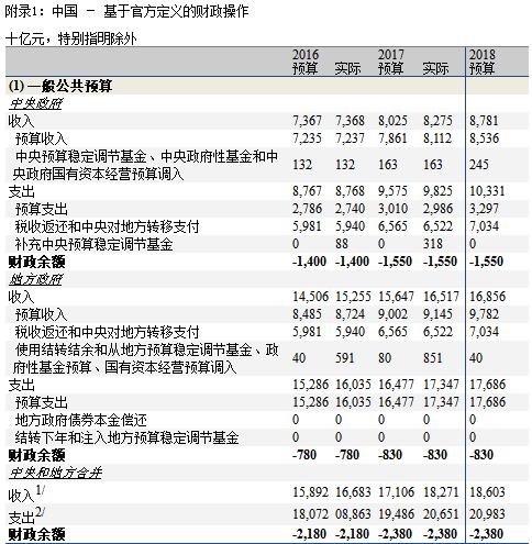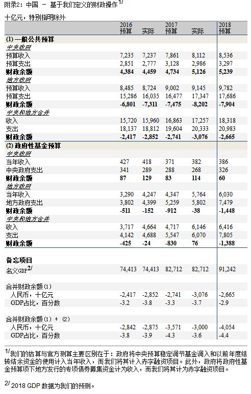 ·2018年政府性基金预算允许地方政府发行1.35万亿元(GDP占比1.45%)的专项债券为收支缺口融资。官方预算中将发行专项债券筹集的资金算作收入(附录1),我们则将债券发行所得归入弥补赤字的融资项目(附录2)。