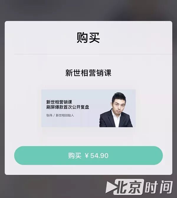“购买成功后,其实还能获得利润分成”,白龙告诉北京时间记者,自己付款时,该课程售价已涨至39.9,“付款成功后,可以生成自己的新世相推广页面,分享至朋友圈,其他人扫码购课,能获利润分成”。