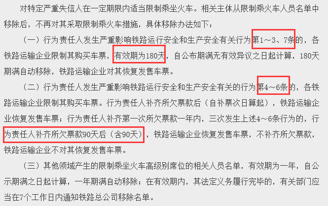 “意见”中指出,将对特定严重失信人在一定期限内适当限制乘坐火车。相关主体从限制乘火车人员名单中移除后,不再对其采取限制乘火车措施。