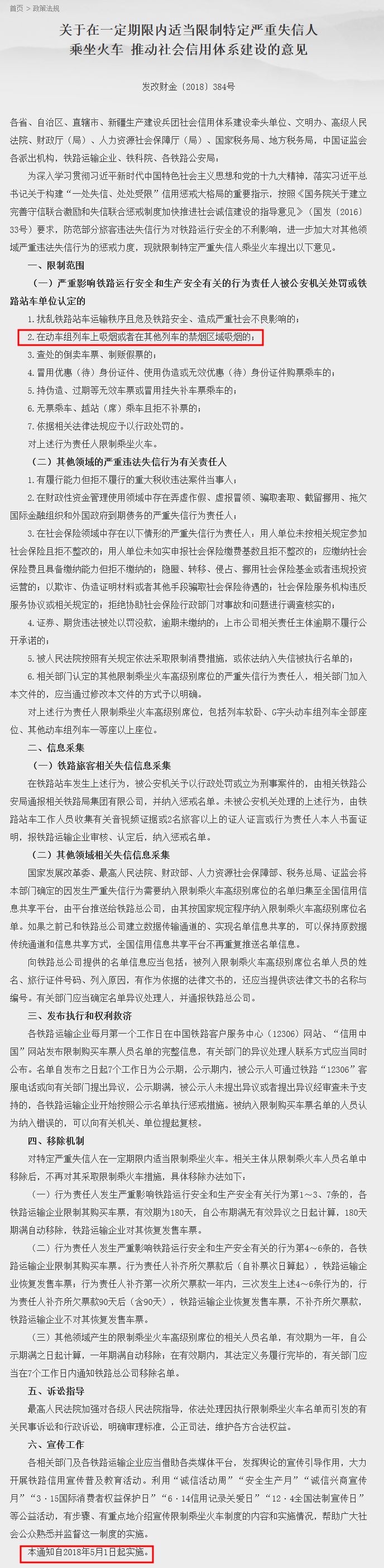 近日,国家发展改革委、中央文明办、最高人民法院、财政部、人力资源社会保障部、税务总局、证监会、铁路总公司发布了《关于在一定期限内适当限制特定严重失信人乘坐火车 推动社会信用体系建设的意见》(以下简称“意见”)。该“意见”将于2018年5月1日起实施。