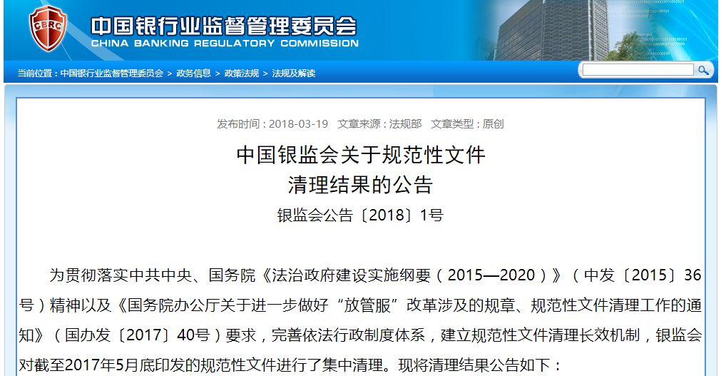 2018年1月30日,中国银监会发布《中国银监会关于废止部分规章的决定》(中国银行业监督管理委员会令2018年2号);3月19日发布《中国银监会关于规范性文件清理结果的公告》(中国银行业监督管理委员会2018年第1号公告),正式公布了银行业规章和规范性文件的清理结果。