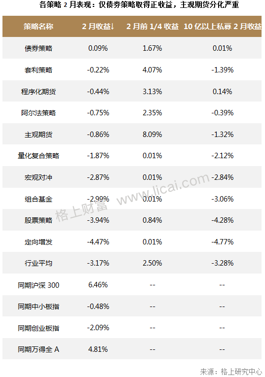 整体来看,2月私募行业平均收益为-3.17%,仅债券策略取得正收益。