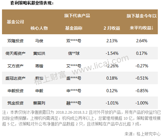 2月份,套利策略表现分化,套利策略产品的收益中位数为-0.31%,排名前1/4产品平均收益3.5%,而后1/4产品平均收益为-5.2%。整体来看,取得正收益的产品数量不足五成。股票市场方面,2月份股市先大幅下跌后反弹,波动率随之先大幅上升后有所下降,期权及股指类的套利产品由于普遍做空波动率所以基本表现为净值先回撤后反弹。商品市场方面,距离5月主力合约还有一段时期,不少机构尚处于建仓期,仓位普遍偏轻,加之适逢春节长假,部分机构进行了仓位调整,商品市场的套利产品净值波动幅度均较小。本月双隆投资代表产品以2.13%的平均收益位列主流机构榜首,大幅超出其他机构,同时旗下基金今年以来平均收益同样位列第一。