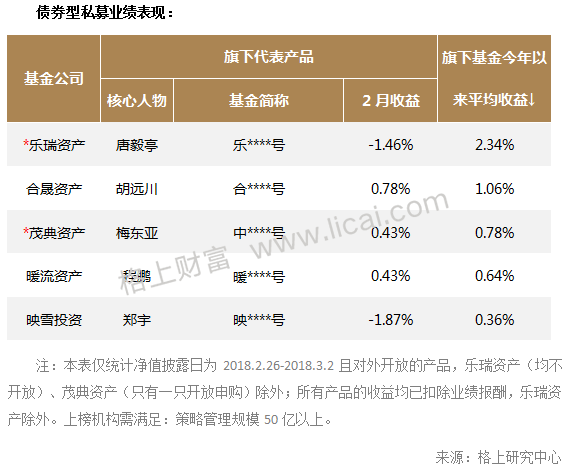 在这样的市场环境中,私募债券基金2月平均收益为0.09%,前四分之一产品平均收益1.67%,位列所有策略排名首位。主流债券机构中,乐瑞资产旗下产品以2.34%的平均收益位列首位。据格上研究中心了解,乐瑞资产的强债产品中配置了部分权益仓位,今年的涨幅大部分由权益贡献,尤其是1月股市较好时贡献较多,而在2月股市发生调整时,也跟着出现了小幅回撤。对于债券市场,乐瑞资产表示看好信用超额收益在今年的表现。