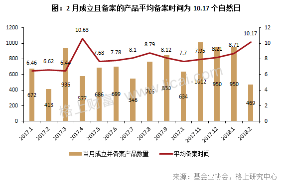 从备案时间来看,2月份当月成立并备案的产品,平均备案时间为10.17个自然日,由于中间间隔春节假期,所以时间有所延长。