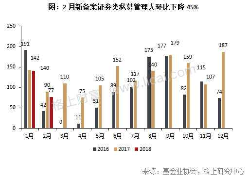据基金业协会最新数据显示,2018 年2 月新备案私募管理人274家,其中新备案证券类私募管理人77 家,环比下降45%。2月并无新成立的证券类私募管理人备案。