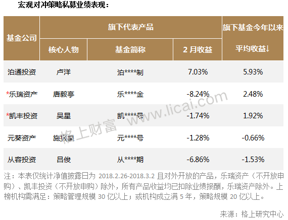 宏观对冲策略2月平均收益为-2.87%,今年以来的平均收益为-1.63%。2月份,股票市场风格突变,前期大涨的蓝筹股如同“飞流而下的瀑布”一样急速下跌,受此影响,大多数宏观对冲策略产品收益为负,回撤程度各有不同。不过泊通投资下的“泊通精选定制”2月份收益依然取得正收益。据格上研究中心了解,泊通投资在市场下跌前期便通过股指期货进行了风险对冲,故在市场回调之际受伤相对较少。且公司判断年前A股市场下跌本身并不是基本面的问题,而是受到外围市场影响,以及惨遭持仓高度相似的公募基金同时抛售。所以公司在下跌后期陆续平掉了股指期货的空头,并且增加了股票仓位,最终在市场反弹时获利颇丰。