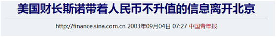 2003年9月,美国财政部长Snow访问中国,向中国政府正式提出了要求人民币升值的意见。