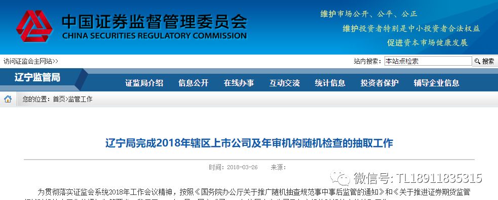 辽宁证监局:对3家上市公司的2017年年报年审机构:致同、中喜、华普天健等随机检查辽宁局完成2018年辖区上市公司及年审机构随机检查的抽取工作为