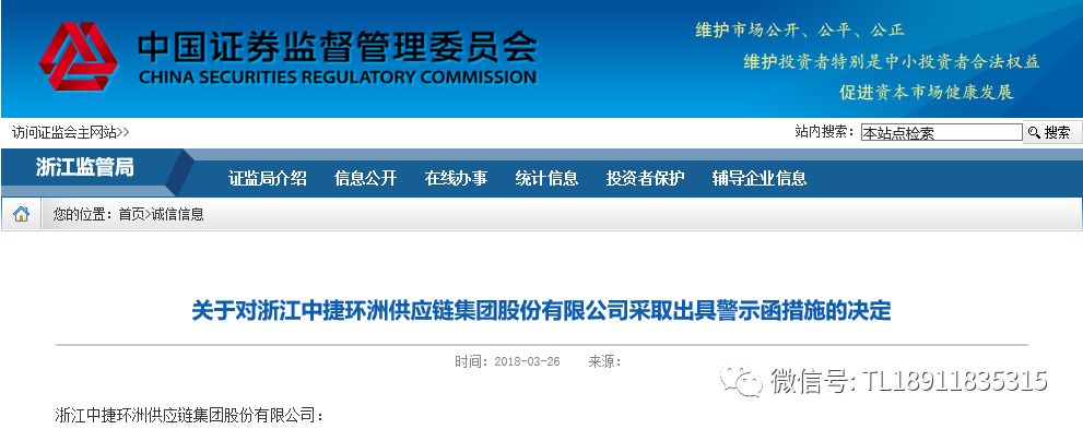 关于对浙江中捷环洲供应链集团股份有限公司采取出具警示函措施的决定浙江中捷环洲供应链集团股份有限公司: 你公司作为中捷资源投资股份有限公