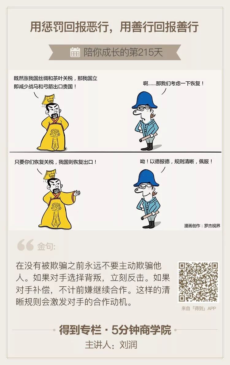 我在《5分钟商学院》基础篇第215课专门讲过这个话题,最佳策略是“一报还一报”。什么叫“一报还一报”?我引用一段《5商》的文字,做个解释。