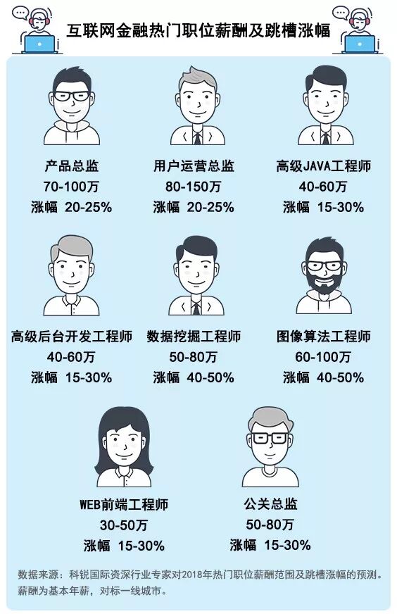 互联网金融整体薪酬趋于平衡,已经没有14年15年的大幅度涨幅,数据算法领域涨幅最快,自然涨幅在15%-20%;数据算法数据挖掘及AI板块,薪酬涨幅可达到40%-50%。