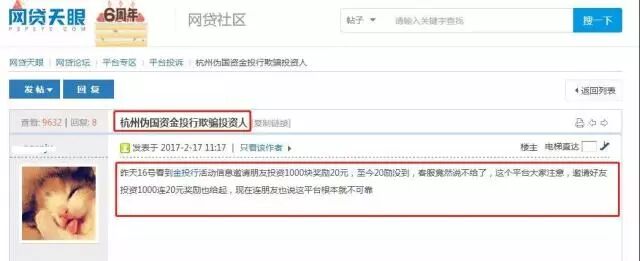 其中标题为:“杭州伪国资金投行欺骗投资人”,贴内称,“昨天16号看到金投行活动信息邀请朋友投资1000块奖励20元,至今20励没到,客服竟然说不给了,这个平台大家注意,邀请好友投资1000连20元奖励也给起,现在连朋友也说这平台根本就不可靠”。