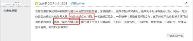 除此之外,金投行频频被投诉。2017年2月,有用户在网贷天眼发布标题为“你们真的是国资系吗?”、“杭州伪国资金投行期限投资人”等投诉贴,而类似负面新闻在百度中搜索也随处可见。