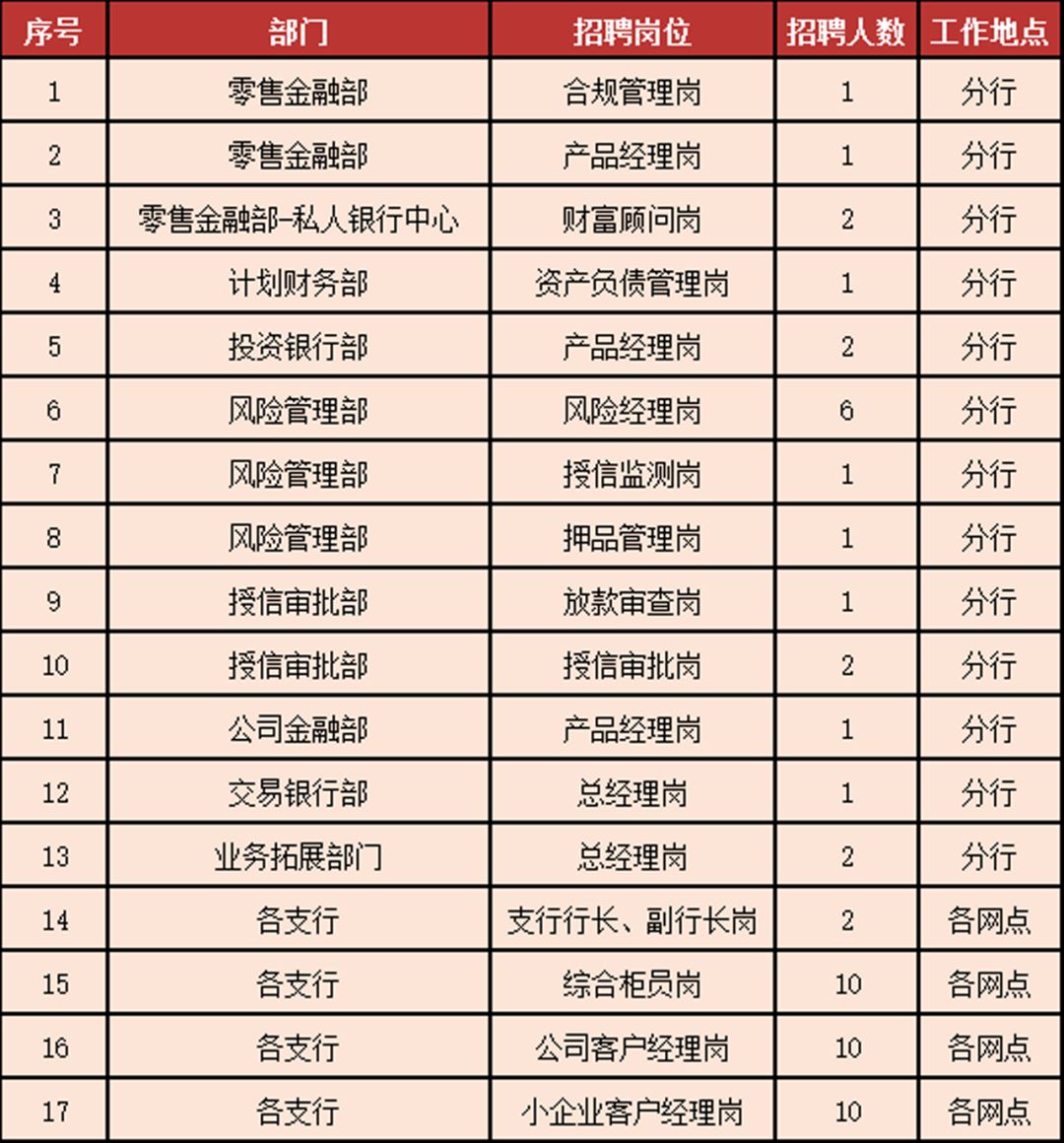 南京银行北京分行于2009年5月16日正式对外营业以来,各项业务稳健、快速发展,赢得了广大客户的认可和支持,在北京市场树立了良好的品牌形象。目前,北京分行员工500余人,营业网点15家,遍布各大城区,实现了规模、质量、效益全面均衡发展。 因业务发展及支行筹建需要,现诚邀业界英才加盟,共同开创美好的事业。我们将为您提供良好的职业发展环境和具有较高市场竞争力的薪酬福利待遇,实现员工和本行事业的共同成长! 1 应聘基本条件 1. 能够自觉遵守国家法律、法规和各项金融规章制度;具有良好的政治素质与职业道德,责任心强、作风正派、廉洁自律,品行、操守方面无不良记录; 2. 具备一定的人际沟通、文字表达及组织协调能力; 3. 本科及以上学历,金融、经济、财务管理、法律等相关专业; 4. 身体健康,能够承受一定的工作压力,条件特别优秀的工作年限及年龄要求可适当放宽。 2 招聘岗位 3 报名时间 2018年4月1日-6月30日24:00 4 岗位详情及 应聘方法 请登陆南京银行官网“招聘信息”界面查询, 或点击文章下方阅读原文查看 点击“阅读原文”,进入官网查看更多招聘信息