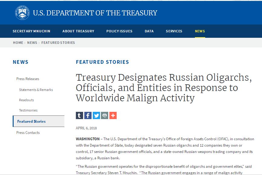 及旗下持有或控股的12家公司(分别为:B-Finance Ltd.、Basic Element Limited、EN+ Group、EuroSibEnergo、United Company RUSAL PLC、Russian Machines、GAZ Group、Agroholding Kuban、Gazprom Burenie、NPV Engineering Open Joint Stock Company、Ladoga Menedzhment、Renova Group)17名俄罗斯高级政府官员(AndreyAkimov、Mikhail Fradkov、Sergey Fursenko、Oleg Govorun、Alexey Dyumin、Vladimir Kolokoltsev、Konstantin Kosachev、AndreyKostin、Alexey Miller、Nikolai Patrushev、VladislavReznik、EvgeniyShkolov、EvgeniyShkolov、Vladimir Ustinov、TimurValiulin、Alexander Zharov、Viktor Zolotov),1家俄罗斯国有武器进出口公司及其子公司——一家俄罗斯银行(Rosoboroneksport及旗下Financial Corporation Bank)进行制裁,以回应俄罗斯在全世界范围内的“全部恶意行为”;并称,受制裁的个人和实体在美国境内的资产将被冻结,美国公民不得与其进行交易,禁止与制裁名单上相关的货物在美国船只上装载或在美国码头上装卸。