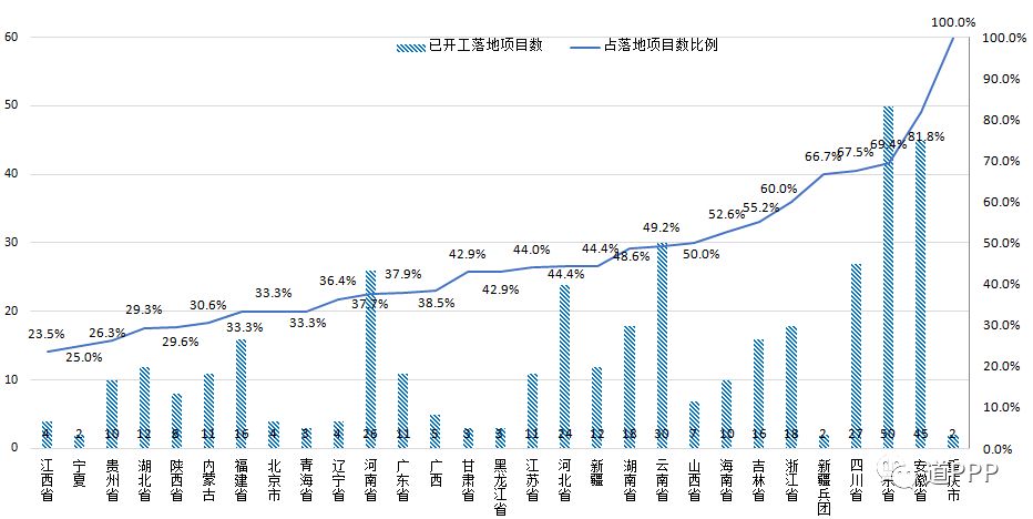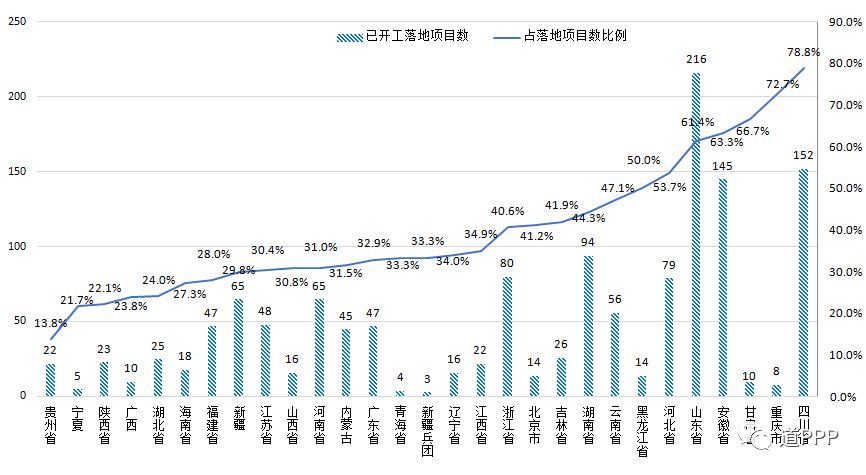 图3-8 截至3月末各地开工项目数及其占落地项目数比例
