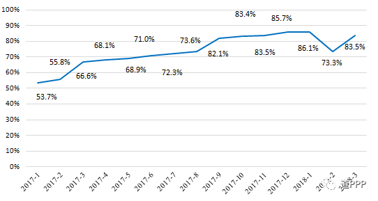 项目落地率,指执行和移交两个阶段项目数之和与管理库项目数的比值。3月落地示范项目新增项目42个、投资额758亿元。3月末示范项目总体落地率83.5%,环比上升10.2个百分点。示范项目总体落地率变化如图2-2-1。