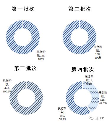 2018年3月末,四批示范项目共1,009个,投资额2.3万亿元,覆盖31个省(自治区、直辖市)及新疆兵团和19个领域。其中,2014年第一批示范项目21个(最初为30个,陆续调出9个),总投资额727亿元;2015年第二批示范项目160个(最初为206个,陆续调出46个),总投资额4,718亿元;2016年第三批示范项目432个(最初为516个,陆续调出84个),总投资额10,088亿元;第四批示范项目396个(2018年2月颁布),总投资额7,571亿元。