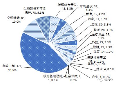 843个落地示范项目中,市政工程类371个,占44.0%;交通运输类84个,占10.0%;生态建设和环境保护类78个,占9.3%;其他各类共310个,占36.2%。3月末落地示范项目行业分布如图2-3-1,各行业示范项目数与落地数对比如图2-3-2。