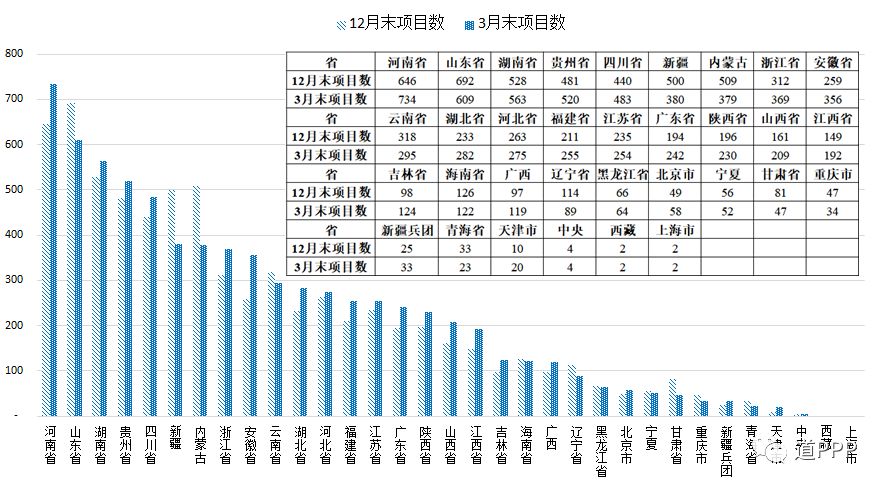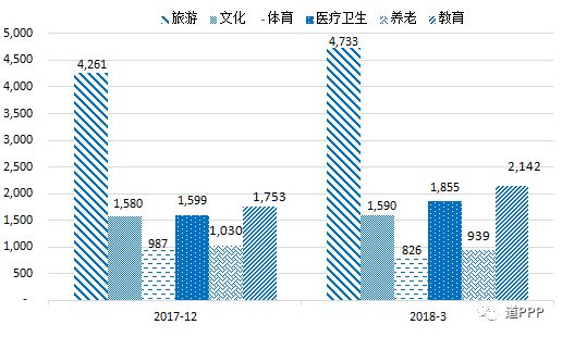 管理库项目执行情况:2018年一季度新增管理库项目283个、投资额7,472亿元,其中3月净减项目171个、投资额4,567亿元;截至3月末累计项目总数7,420个、投资额11.5万亿元。落地项目,2018年一季度新增落地项目595个、投资额9,044亿元,其中3月新增落地项目333个、投资额1,362亿元。落地率环比增加5.4个百分点。3月末累计落地项目总数3,324个、投资额5.5万亿元,落地率44.8%。2018年一季度新增已开工项目216个,其中3月新增123个;3月末累计已开工项目总数1,375个,开工率41.4%。地区方面,2018年一季度管理库新增项目数前三位的是安徽、河南、浙江,分别为97个、88个、57个;一季度项目新增投资额前三位的是贵州、安徽、广东,分别为1,297亿元、1,194亿元和1,116亿元。3月管理库新增项目数前三位的是山西、河南、江苏;新增投资额前三位的是贵州、广西、河北。3月末累计项目总数前三位的是河南、山东(含青岛)、湖南,分别为734个、609个、563个,累计投资额前三位的是贵州、湖南、河南,分别为9,749亿元、8,876亿元、8,763亿元。行业方面,2018年一季度管理库新增项目数前三位是市政工程、交通运输、生态建设和环境保护,分别为116个、98个、54个;项目新增投资额前三位的是城镇综合开发、交通运输、市政工程,分别为2,842亿元、2,032亿元、1,298亿元。3月末累计项目总数前三位的是市政工程、交通运输、生态建设和环境保护,合计占管理库项目总数的60.5%,累计投资额前三位的是市政工程、交通运输、城镇综合开发,合计占管理库总投资额的72.3%。基本公共服务领域(文化、体育、医疗、养老、教育、旅游等6个领域)项目一季度项目数比上季度末下降1个,新增投资额875亿元。3月末累计项目总数1,349个、投资额12,084亿元。回报机制,一季度使用者付费类项目净减项目424个、投资额3,567亿元;可行性缺口补助类项目新增项目493个、投资额9,328亿元;政府付费类项目新增项目214个、投资额1,710亿元。3月末累计使用者付费类项目899个、投资额1.2万亿元;累计可行性缺口补助类项目3,423个、投资额6.8万亿元;累计政府付费类项目3,098个、投资额3.5万亿元。污染防治与绿色低碳项目一季度新增项目23个、投资额443亿元。3月末累计项目总数4,002个、投资额4.1万亿元。